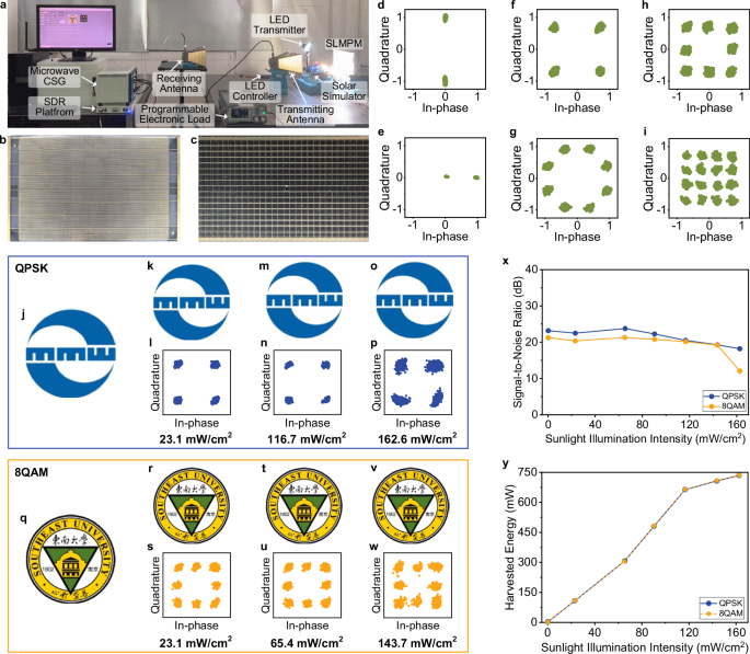 東南大學 Tie Jun Cui、Wei Xiang Jiang 團隊提出了一種太陽能供電的光調制微波可編程超表面 (SLMPM),它集成了一個光伏模塊,可以同時獲取調制光的信息和陽光的能量。這種 SLMPM 能夠在陽光直射下實現(xiàn)從光到微波領域的直接、實時和可靠的信息傳輸,并可以靈活地實施各種調制方案。它的低功耗和板載能量收集能力允許在 8 小時的單一陽光能量輸入下進行 24 小時的光到微波信息傳輸。作者展示了一種用于實時圖像傳輸?shù)幕旌蠠o線通信系統(tǒng),以體現(xiàn) SLMPM 的突出特點。作者相信 SLMPM 可以為未來無線通信的可持續(xù)發(fā)展做出貢獻,使其更具成本效益、節(jié)能、環(huán)保和無處不在。